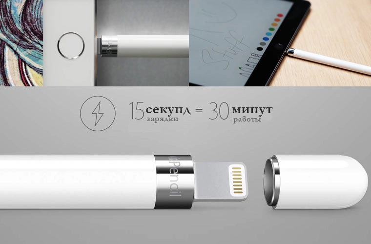 Зарядка. Apple Pencil можно заряжать от своего же планшета. Под колпачком ручки скрывается Lighting: снимаете, подключаете к iPad, готово. 15 секунд зарядки хватит на 30 минут работы электронного пера.