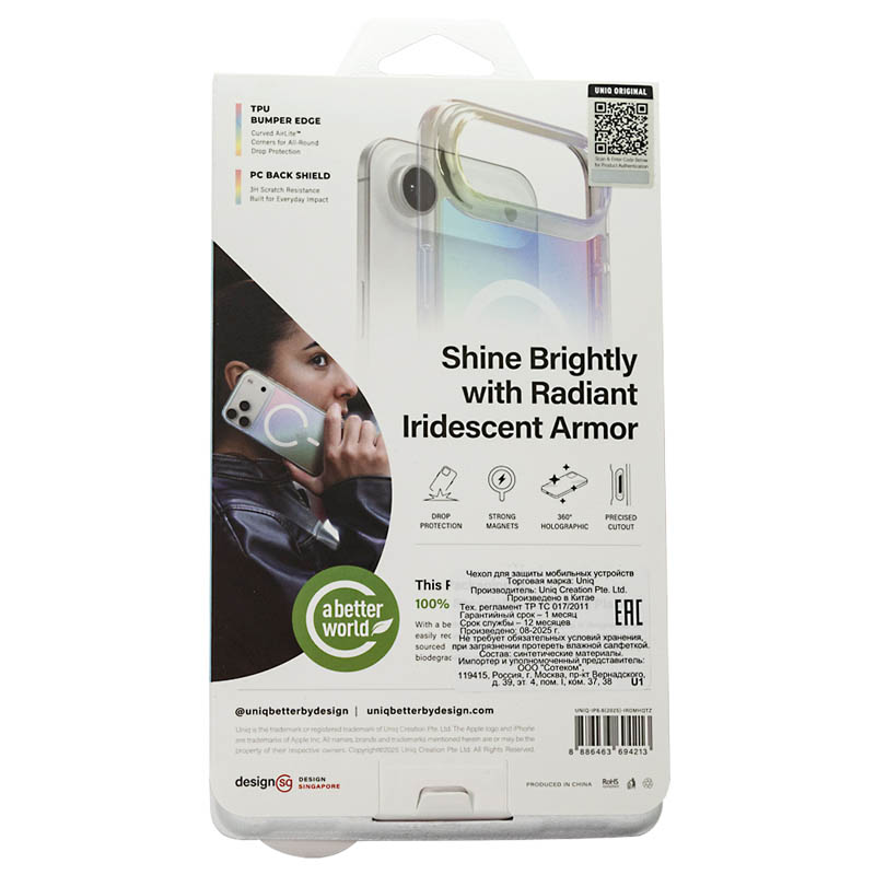 Чехол Uniq Iridescia Holo Quartz для iPhone 17 Air сочетает яркий голографический дизайна, переливающийся под разными углами, и надежную защиту от падений до 2,5 метров. Выступающий бортик вокруг камеры защищает объектив от царапин. Присутствует поддержка беспроводной зарядки MagSafe.