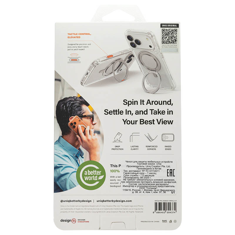 Чехол Uniq Swivix для iPhone 17 с вращающейся на 360 градусов подставкой позволяет устанавливать её под любым удобным углом. Кроме того, прочное металлическое кольцо-держатель гарантирует надёжный захват. Усиленные углы для повышенной защиты от падений. Выступающий бортик вокруг камеры защищает объектив от царапин. Присутствует поддержка беспроводной зарядки MagSafe.