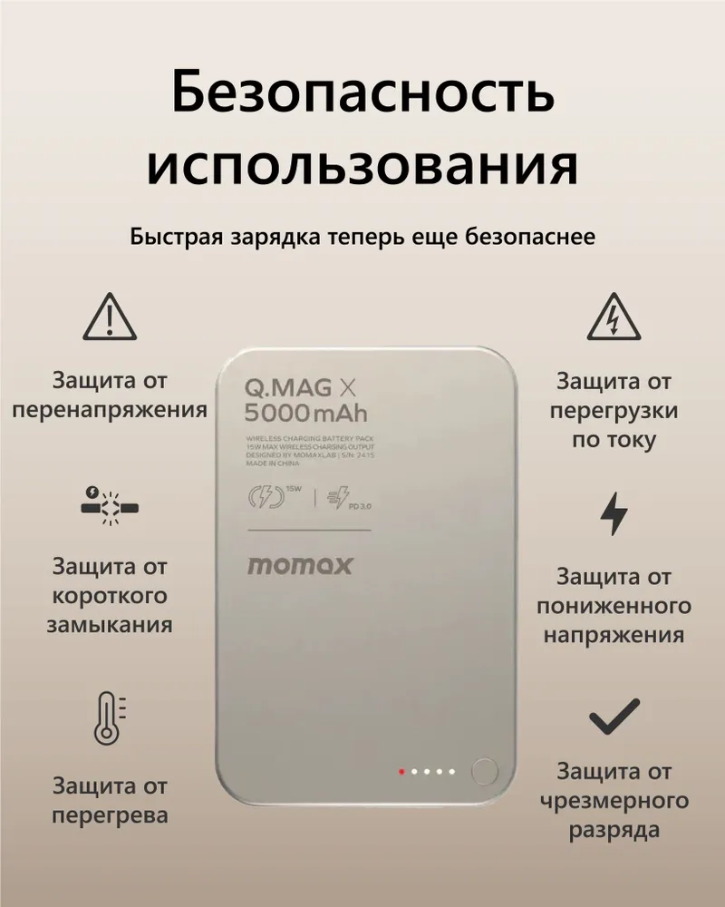 Powerbank Momax IP116AD– это идеальное решение для тех, кто ценит удобство и надежность. Благодаря функции автоматической индукционной зарядки, достаточно просто прикрепить телефон для начала зарядки, что делает процесс более удобным и быстрым. Легко распознает устройства с низким током, обеспечивая оптимальную подачу энергии. Поддержка беспроводной зарядки Qi и Qi2 позволяет заряжать устройства с мощностью до 15 Вт, обеспечивая ультрабыструю зарядку. Магнитное крепление позволяет легко прикреплять зарядное устройство к устройствам, поддерживающим Magsafe и Qi2. Встроенная система защиты от перегрева, перезаряда, коротких замыканий и FOB гарантирует безопасность использования.