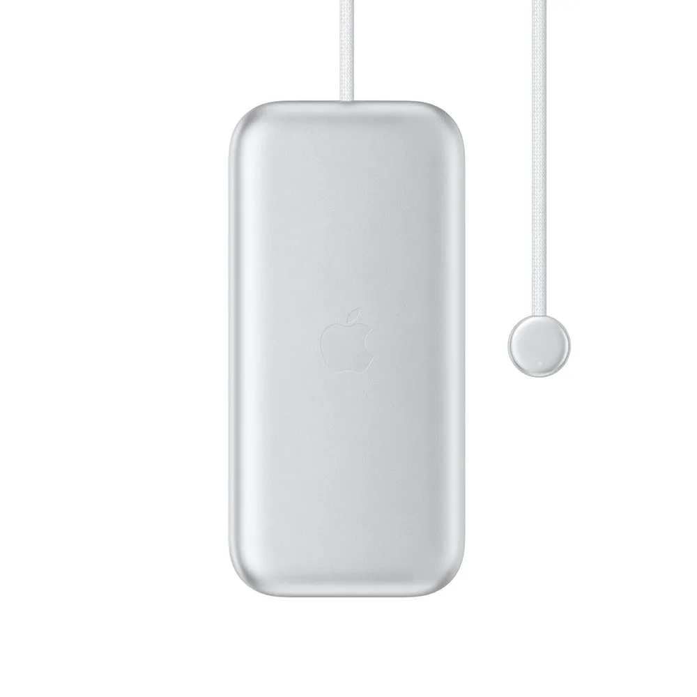Высокопроизводительный аккумулятор Apple Vision Pro изготовлен из гладкого обработанного алюминия и подключается к устройству Apple Vision Pro с помощью плетеного кабеля USB-C. Его можно положить в карман для портативного питания, и он обеспечивает до двух часов обычного использования, 2,5 часа воспроизведения видео и использование в течение всего дня при подключении к сети.